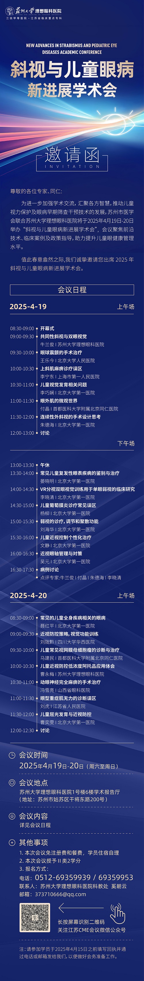 為響應"健康中國2030”規劃綱要》對兒童青少年視力保護的戰略部署,蘇州市醫學會聯合蘇州大學理想眼科醫院,定于2025年4月19日-20日舉辦“斜視與兒童眼病新進展學術會”。本次會議聚焦前沿技術、臨床案例及政策指導等核心議題展開深度研討,誠邀全國眼科專家、同仁相聚蘇州,共話兒童眼健康管理新未來!