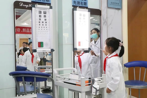 小朋友拿著指示棒,有模有樣地模仿醫生的語氣,認真程度絲毫不輸專業醫師。這場別樣的體驗,不僅讓孩子們過了一把 “醫生癮”,更在互動中學會了正確的視力檢查方法。