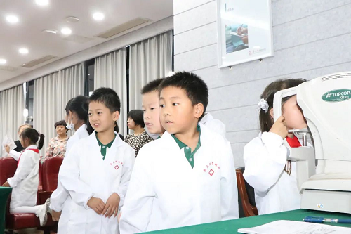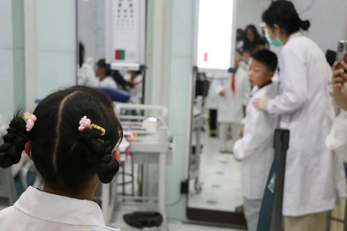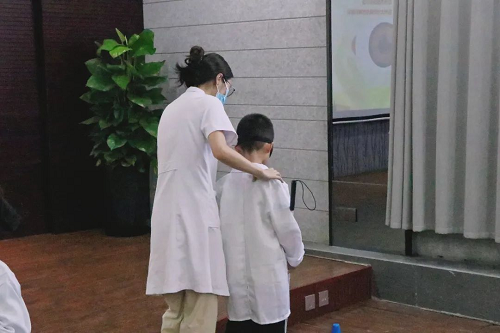換上定制的迷你白大褂,孩子們瞬間進入 “工作狀態”。在眼科醫護人員的帶領下,他們兩兩一組化身 “醫患搭檔”,用視力表為同伴做 “視力篩查”。