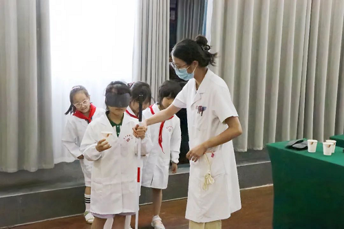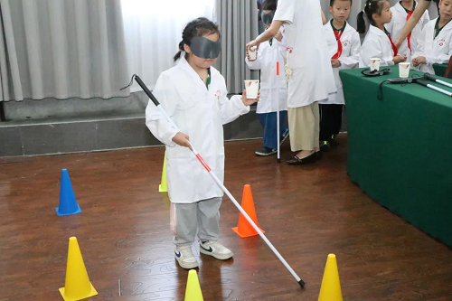 在 “黑暗體驗” 里,孩子們輪流戴上遮光眼罩,一邊手持盲杖,一邊手端水杯,小步探索由雪糕筒搭建的 “障礙路”。在失去視覺后,走路變得陌生又棘手,不少孩子下意識停住腳步不敢向前,也有不少孩子在家長和醫生的鼓勵下成功走回原點。