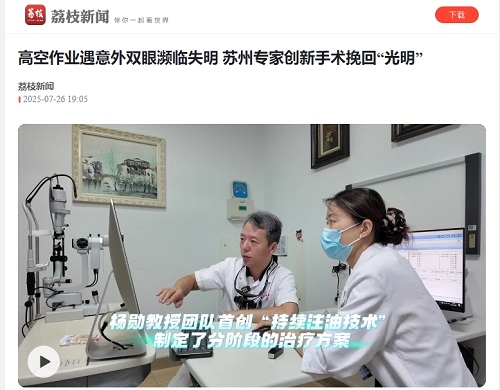 據江蘇廣電蘇州站報道,一位雙眼眼球嚴重破裂,曾被多家醫院判定為治療難度極大、預后不佳的重癥眼外傷患者,在該院楊勛教授團隊的精心救治下,運用首創的“持續注油技術”,視力逐步恢復。這一生動報道再次彰顯了醫院在眼外傷及眼底病診療領域的專業實力。