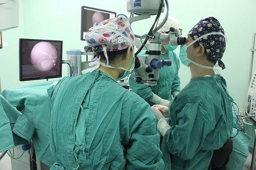 為實現脫離脈絡膜復位、維持眼球形態,團隊先為其實施右眼手術,通過眼內注入惰性氣體擴張眼球,逐步將眼壓提升至正常范圍,為后續手術創造穩定的眼部內環境。