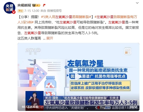 國內外研究均證實,口服和靜脈使用的左氧氟沙星可能增加肌腱損傷的風險。但整體發生率為0.1%~0.4%(即每1000名用藥者中約1-4例),并不是常見的不良反應。