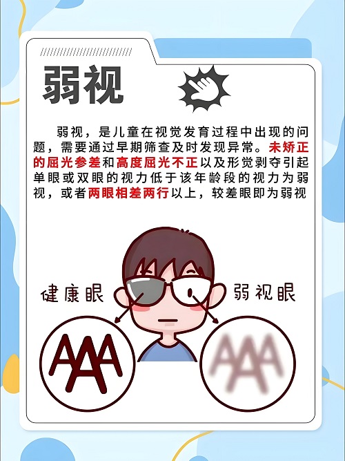 弱視則指即使佩戴合適眼鏡,視力仍低于正常水平,伴有視物模糊、閱讀困難等問題,多因兒童視覺發育關鍵期存在斜視、高度遠視等問題。
