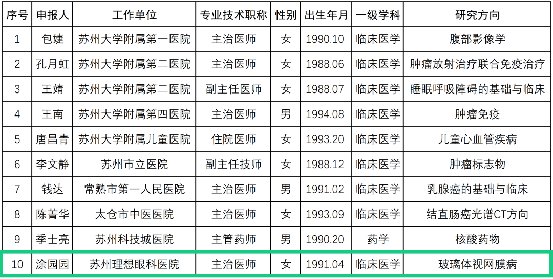 近日,蘇州市醫學會公布2025年度“姑蘇醫星”青年科技人才托舉工程資助名單,我院玻璃體視網膜病研究領域青年骨干醫師涂園園成功入選,成為本年度全市入選的10名青年醫師之一。這既是對其個人專業能力與科研潛力的高度認可,也是我院在青年人才培養與醫學科研創新領域的重要成果體現。