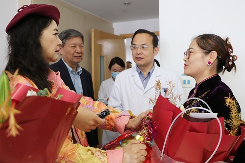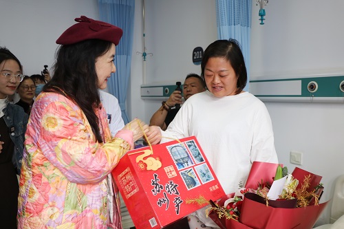 隨后,胡慧中一行前往住院部探訪由蘇州看見吳中基金會提供幫助,醫院角膜病科主任趙慶亮主刀的兩位角膜移植術后患者。在病房內,她仔細詢問患者恢復情況,與患者親切握手、拍照、交流,聆聽患者講述治療經歷,鼓勵他們保持樂觀與感恩,稱贊醫護團隊的精心照料,并為患者送上鮮花與蘇州特產,現場氛圍溫馨感人。