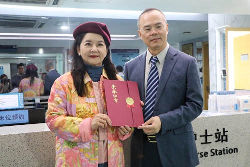 蘇州大學理想眼科醫院黨支部書記、CEO黃俊偉介紹醫院在“一帶一路”眼科合作、公益項目開展方面的成果,并為胡慧中頒發光明大使紀念證書,感謝她以無私的愛心與關懷,親臨醫院探訪角膜移植患者,以紀念女生為傳遞光明與希望所做出的寶貴貢獻。胡慧中表示,未來將持續支持眼科公益項目,讓光明與希望惠及更多人。