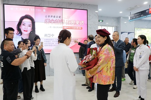 10月25日下午胡慧中抵達醫院,于“光明同行,一路有我”主題電子墻前合影留念,正式開啟公益行程。前期通過醫院微信公眾號評選出的8名幸運粉絲,與胡慧中近距離見面。