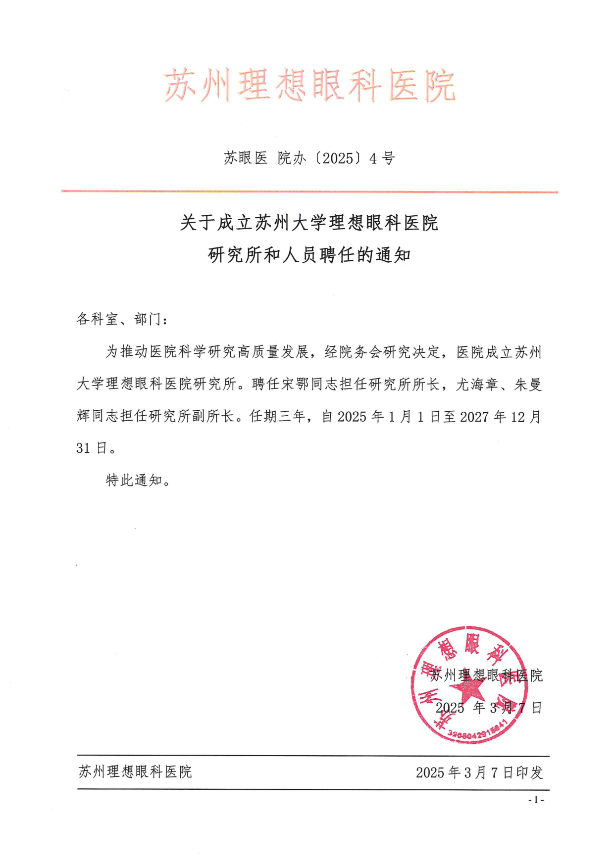 關于成立蘇州大學理想眼科醫院研究所和人員聘任的通知